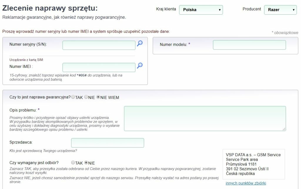 Niezależnie od wyboru drogi reklamacyjnej nasze urządzenie wcześniej czy później trafi do właściwego serwisu. Jeśli wybierzemy samodzielne zgłoszenie smartfona, to z pewnością oszczędzimy sporo czasu pomijając obsługę u sprzedawcy. Zgłoszenie telefonu Razer Phone do serwisu jest banalnie proste, bowiem wystarczy wejść na stronę internetową serwisu VSP DATA oraz wypełnić formularz podając wszystkie dane naszego urządzenia, oraz dane odbioru urządzenia.