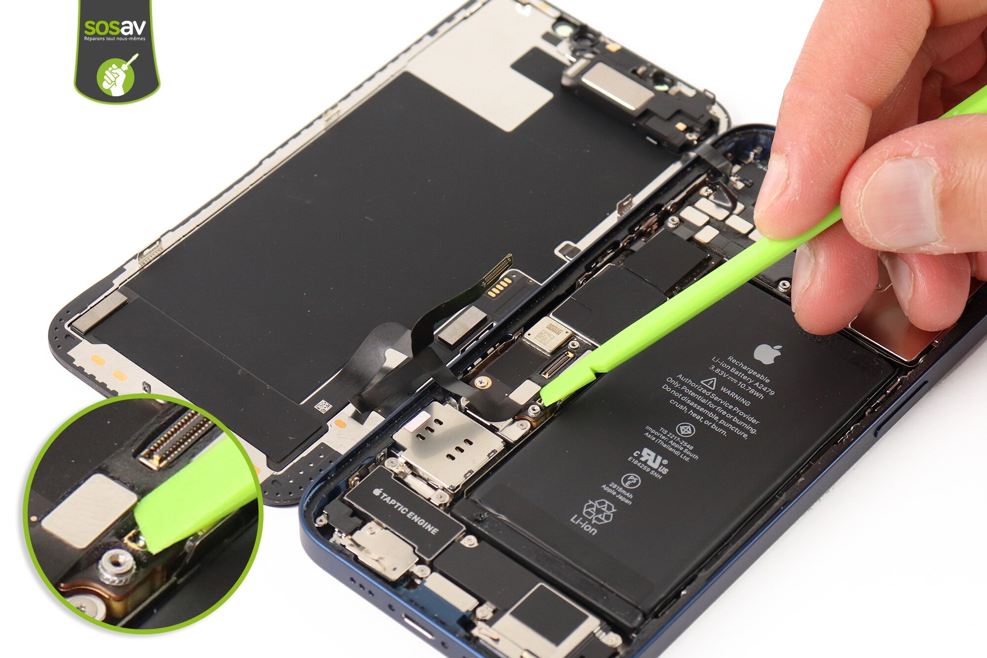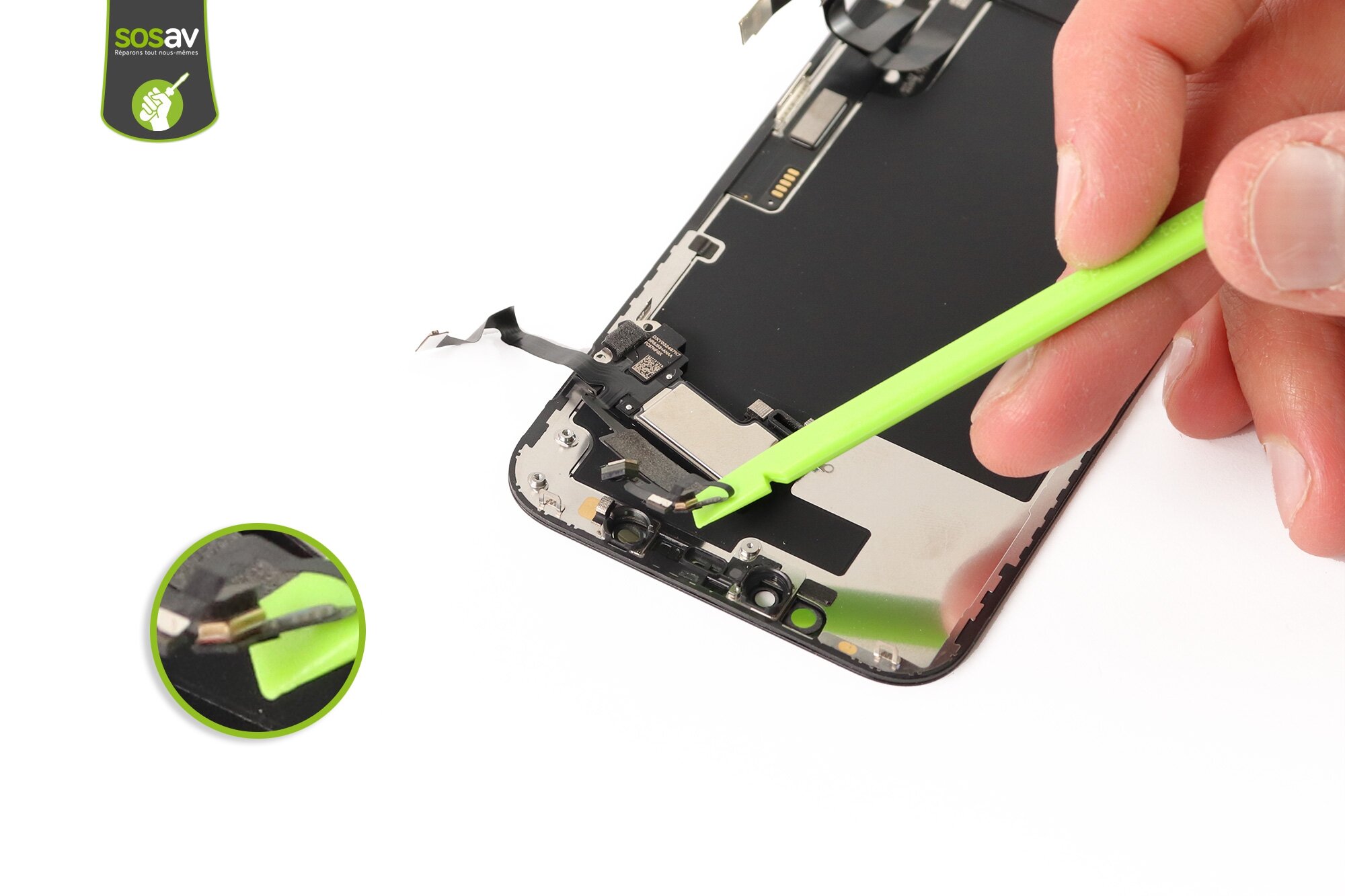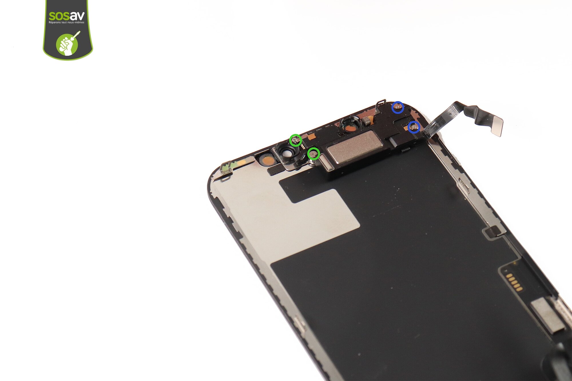Po rozchyleniu ekranu naszym oczom ukazuje się wnętrze smartfona. Widzimy tam przeróżne elementy. Nas będą interesować dwie blaszki, które blokują nam odłączenie taśm wyświetlacza. Używamy do tego śrubokręta tri-wing (śrubokręt posiadający trójskrzydłowe wyżłobienie na główkach śrubek). Po odkręceniu wszystkich wkrętów pamiętajmy, aby ułożyć je w prawidłowej kolejności. Najlepiej koło blaszek oraz ich otworów. W przypadku smartfonów iPhone bardzo często mamy do czynienia nie tylko z innymi wkrętami, ale również inną długością.
