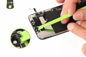 Po zdemontowaniu blaszek zostaje nam odłączenie wszystkich taśm od urządzenia. Dzięki czemu odłączamy ekran, akumulator oraz głośnik do rozmów. Do tej czynności używamy nylonowej szpatułki lub innego cienkiego narzędzia, którym sami możemy odłączyć całość. Te działania pozwolą nam swobodnie oddzielić uszkodzony wyświetlacz.