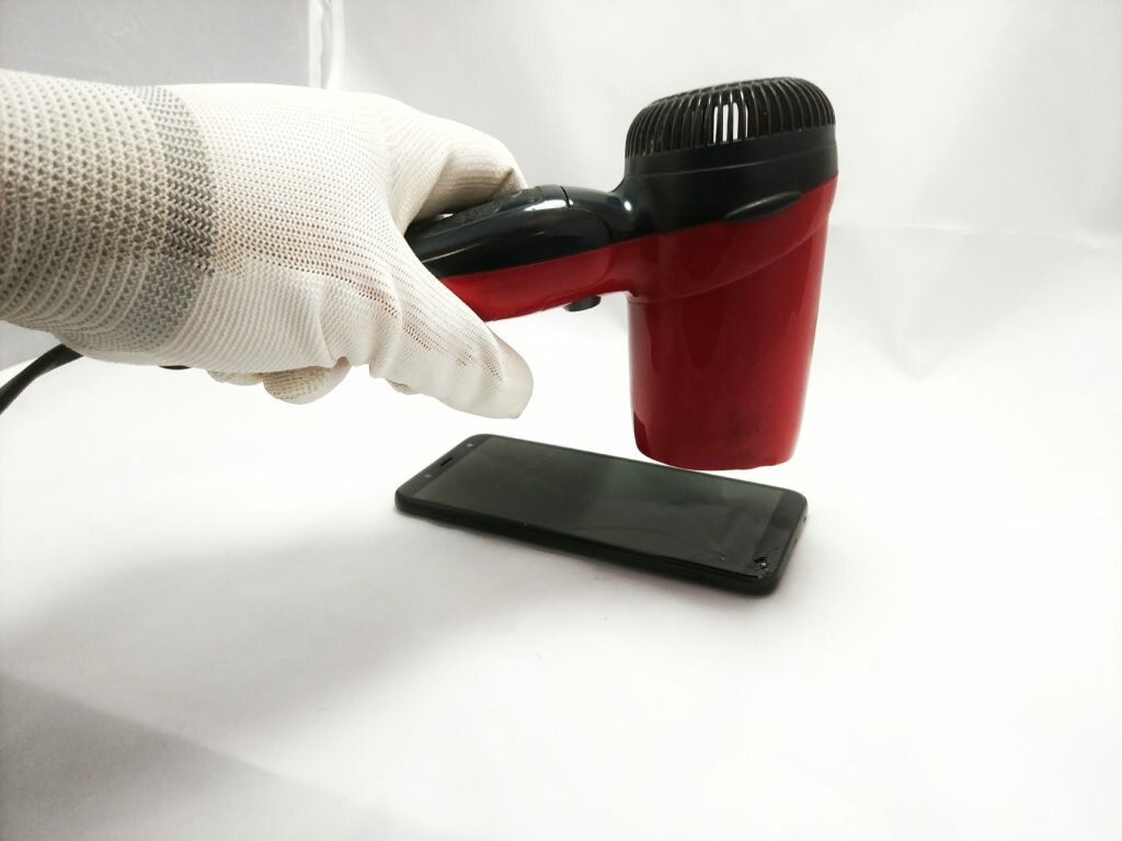 Po odpowiednim przygotowaniu stanowiska (w domowych warunkach może to być zwykły stół oraz biała powierzchnia, na której łatwo będziemy wiedzieli drobne elementy) możemy spokojnie przystąpić do pierwszej i w zasadzie najważniejszej czynności, czyli podgrzania pękniętego ekranu w telefonie Samsung Galaxy J6. Używamy do tego opalarki lub najzwyklejszej suszarki do włosów. Ta czynność w zależność od stopnia nadmuchu powinna trwać mniej więcej około 5-10 minut, pamiętajmy jednak, aby ciepło z naszego „zgrzewacza” rozprowadzać równomiernie po całym wyświetlaczu. Zbyt długie zgrzewanie jednego miejsca (w szczególności przy użyciu opalarki) może spowodować stopienie się różnych elementów. Dlatego zalecamy ostrożność.
