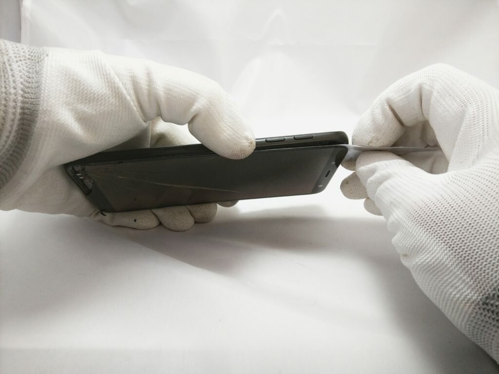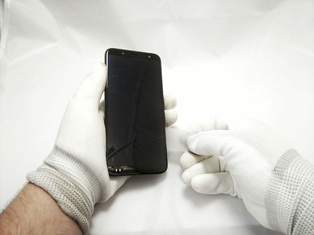 Gdy wyczuwamy, że ekran telefonu Samsung Galaxy J6 został już podgrzany, możemy przystąpić do jego demontażu. W tym celu warto użyć cienkiej kostki serwisowej, którą możemy zacząć podważać LCD. Warto rozpocząć od miejsca, gdzie uszkodzenie jest największe. Umożliwi nam to swobodne złapanie „tego pierwszego kontaktu” ze szczeliną, poprzez którą za chwilkę będziemy podnosić wyświetlacz do góry. Pamiętajmy, że fabryczny klej takich urządzeń znajduje się głównie na ramkach, dlatego cienki opener, który możemy wsunąć do środka posłuży nam idealnie jak nożyk. W sytuacji problemów podniesienia wyświetlacza w telefonie Samsung Galaxy J6 zawsze możemy skorzystać z przyssawki do szyb lub żyletki.