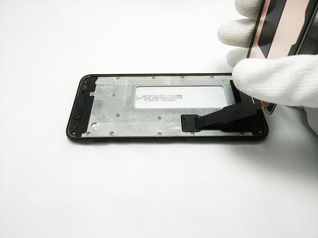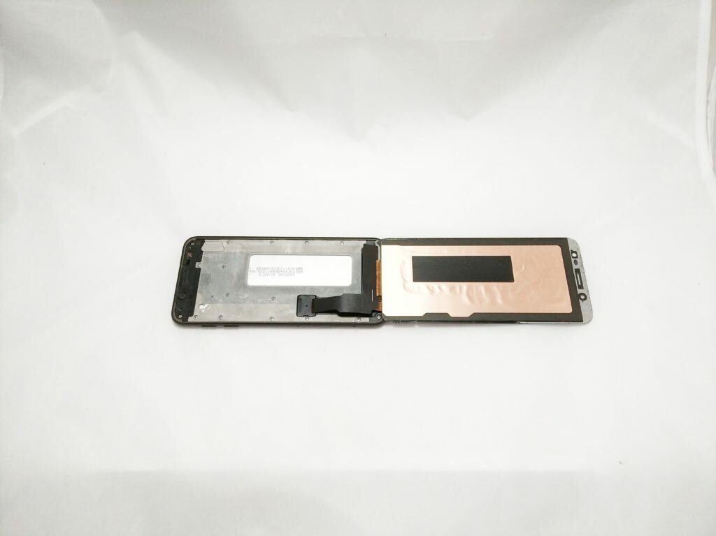 Stosowne przesuwanie openera powtarzamy, aż do całkowitego odłączenia modułu wyświetlacza w telefonie Samsung Galaxy J6. Gdy uda się nam wykonać ten zabieg, należy pamiętać, że moduł LCD jest połączony z płytą główną, dlatego ekran należy delikatnie wykręcić go do góry. Jak widzicie takie ułożenie niesie za sobą pełną swobodę całkowitego wymontowania ekranu w naszym modelu Galaxy J6.