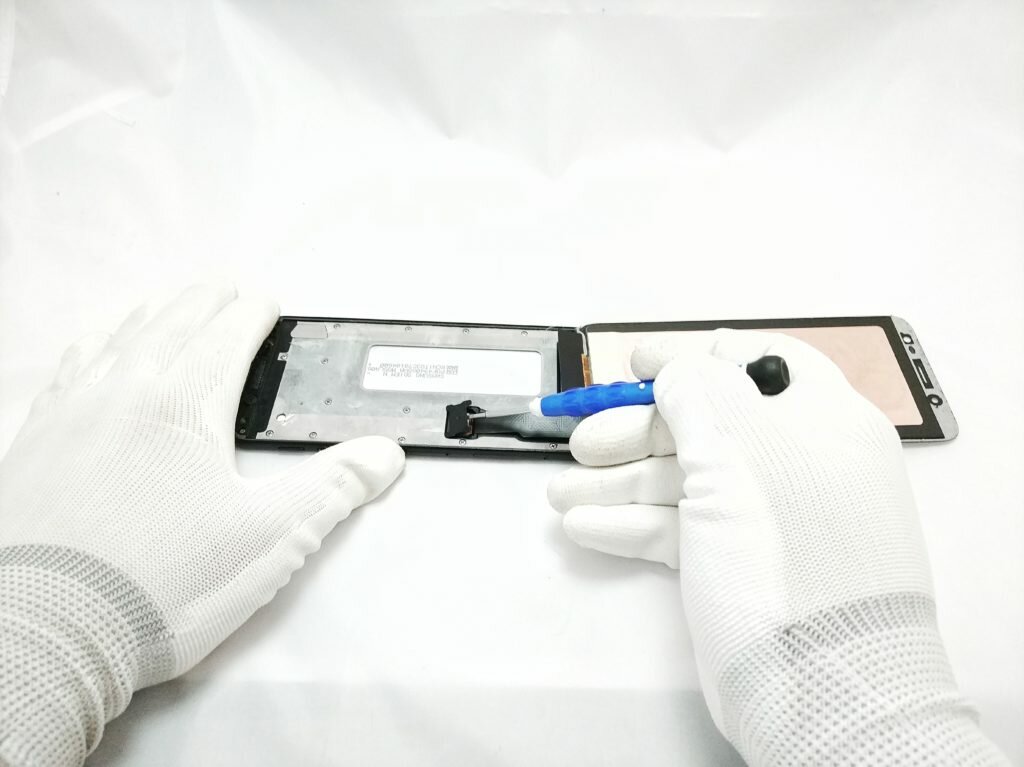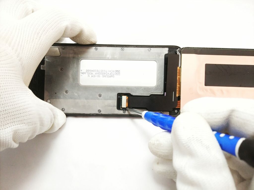 Na tym etapie naprawy nie pozostaje nam nic innego, jak użyć pęsety lub innego otwieraka celem zdemontowania małej osłonki znajdującej się na złączu taśmy od wyświetlacza modelu Samsung Galaxy J6. Technicy firmy SmartSerwis24 mając długoletnie doświadczenie używają do tego śrubokręta, jednak nasza redakcja osobom mniej doświadczonym sugeruje skorzystać z paznokcia lub kostki serwisowej.