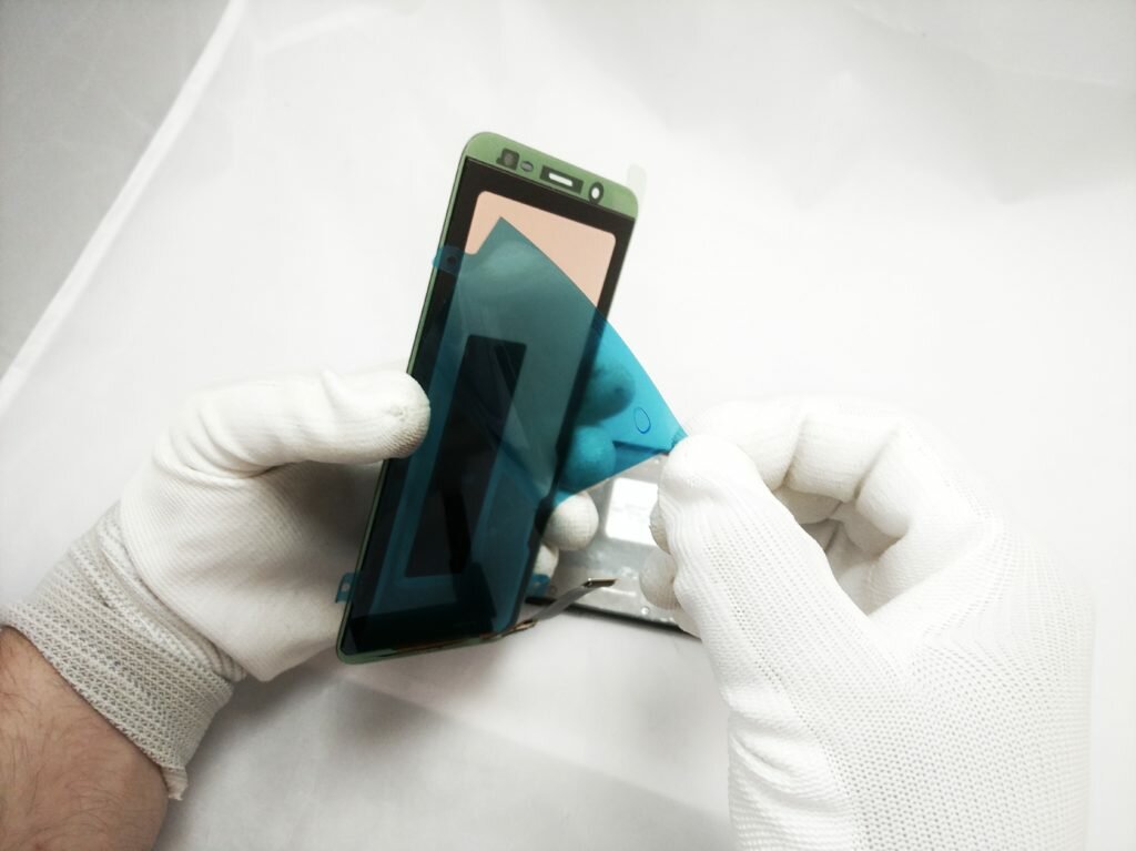 W opisowym przypadku nie trzeba było zrywać starych pozostałości, gdyż wszystkie ładnie odeszły razem z pękniętym wyświetlaczem telefonu Samsung Galaxy J6. Technikowi firmy SmartSerwis24 pozostało jedynie odtłuścić ramkę, używając do tego alkoholu izopropylowego. Na tak przygotowany korpus urządzenia możemy zamontować nowy ekran, aby to zrobić wyświetlacz telefonu Samsung Galaxy J6 pokrywamy klejem w postaci stickerów.