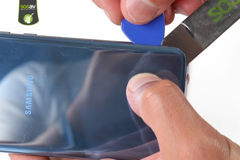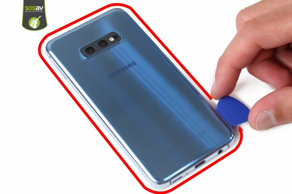 Następnym etapem naprawy jest demontaż pokrywy baterii. Do tej czynności używamy najcieńszego openera. Szukając cienkiej szczeliny próbujemy delikatnie wsunąć narzędzie w pierwszą lepszą szczeline. Gdybyśmy mieli problemy, możemy spróbować podnosić pokrywę przyssawką, co pozwoli nam swobodnie wsunąć inne cienkie narzędzia serwisowe. Przy najdrobniejszych szczelinach staramy się wsunąć kostkę serwisową lub inne narzędzie, którym będziemy mogli powoli odklejać klapkę baterii. Demontując klapkę baterii w telefonie Samsung Galaxy S10e warto skorzystać ze specjalnej kostki serwisowej. Przesuwając narzędzie brzegi pokrywy baterii możemy swobodnie odklejać tak, abyśmy mogli finalnie odseparować cały element. Czynność powtarzamy do całkowitego odklejenia. Pamiętajmy, że gdyby klej zastygł, a jakiś fragment pokrywy baterii stawiałby opór przed demontażem, możemy ponownie podgrzać miejsce utrudniające dalszą rozbiórkę.