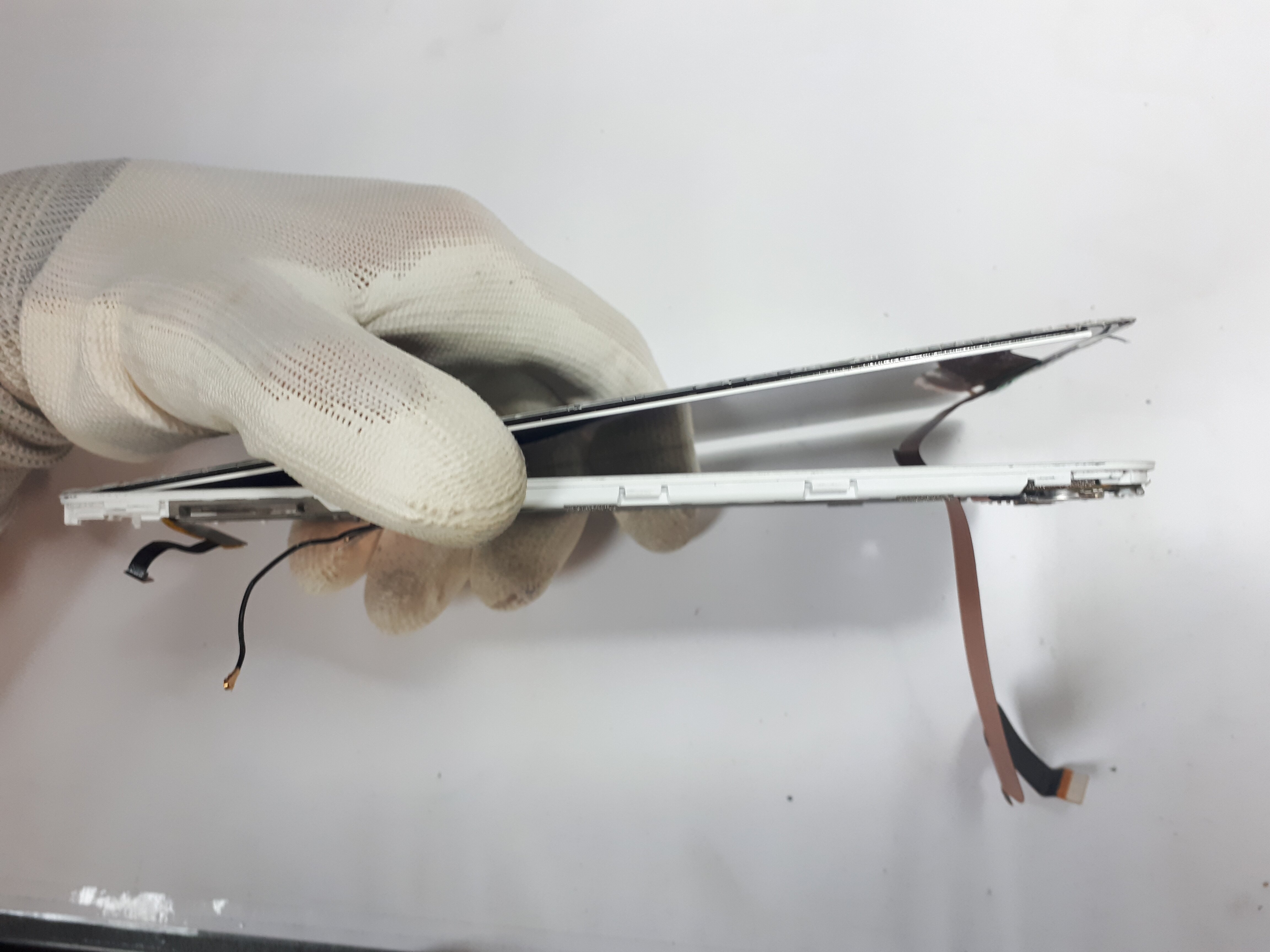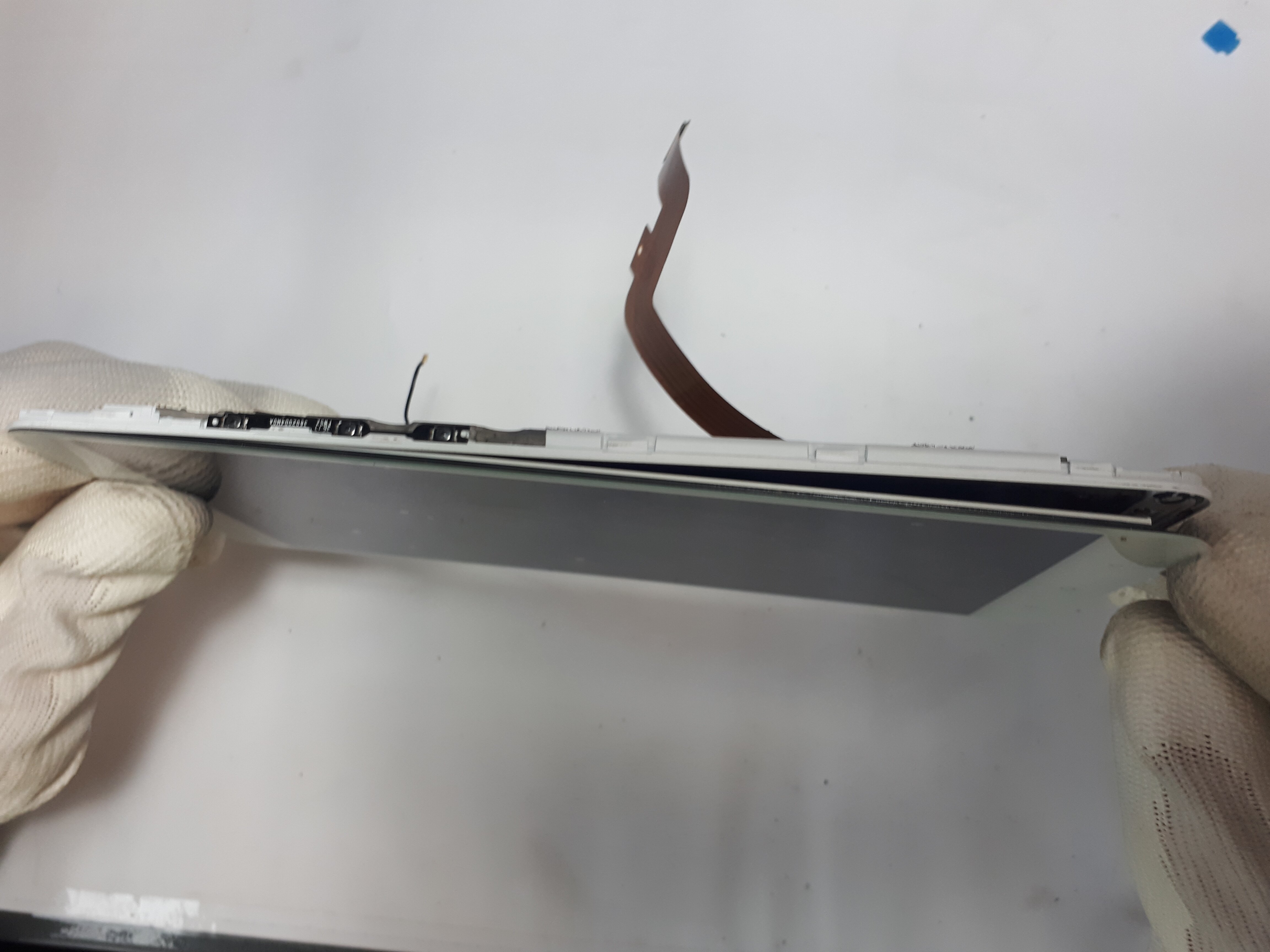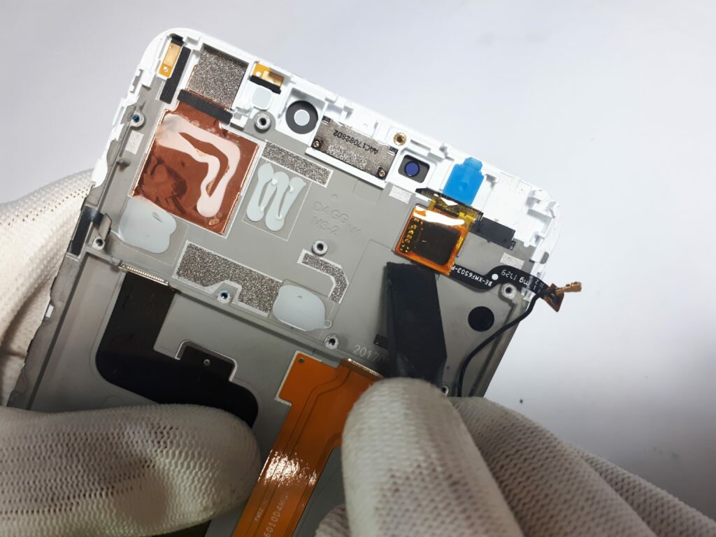 Górną taśmę, która jest lekko przyklejona delikatnie odchylamy, zaś główną przebiegając bezpośrednio pod zdemontowaną baterią odklejamy. Przy demontażu obie taśmy z konektorami będą musiały zostać „przeciśnięte” przez specjalne otwory w korpusie. Czas zmienić pozycje urządzenia od strony pękniętego wyświetlacza, który musimy podgrzać celem wyklejenia go z całego korpusu. Do tej czynności używamy suszarki lub opalarki.