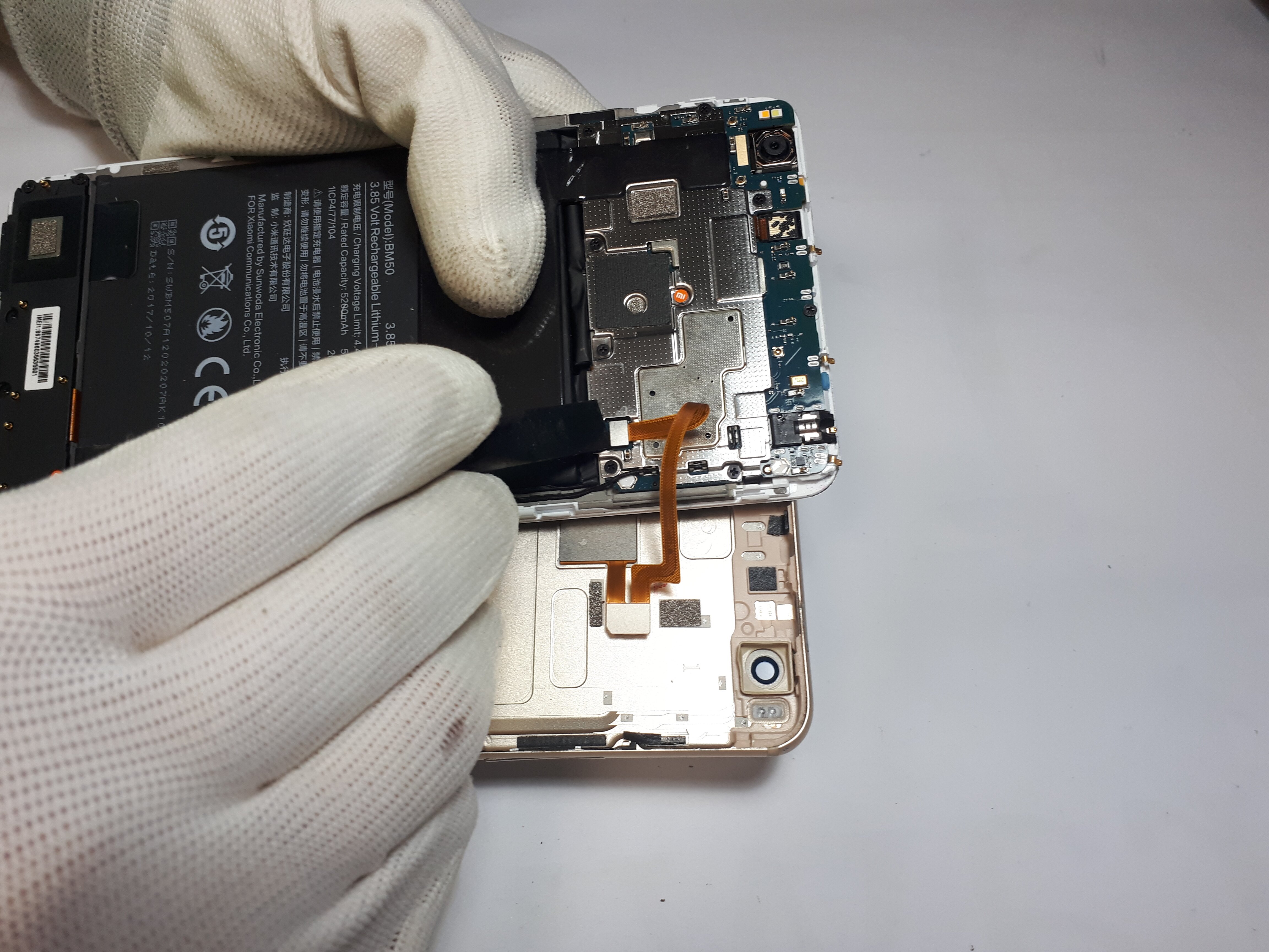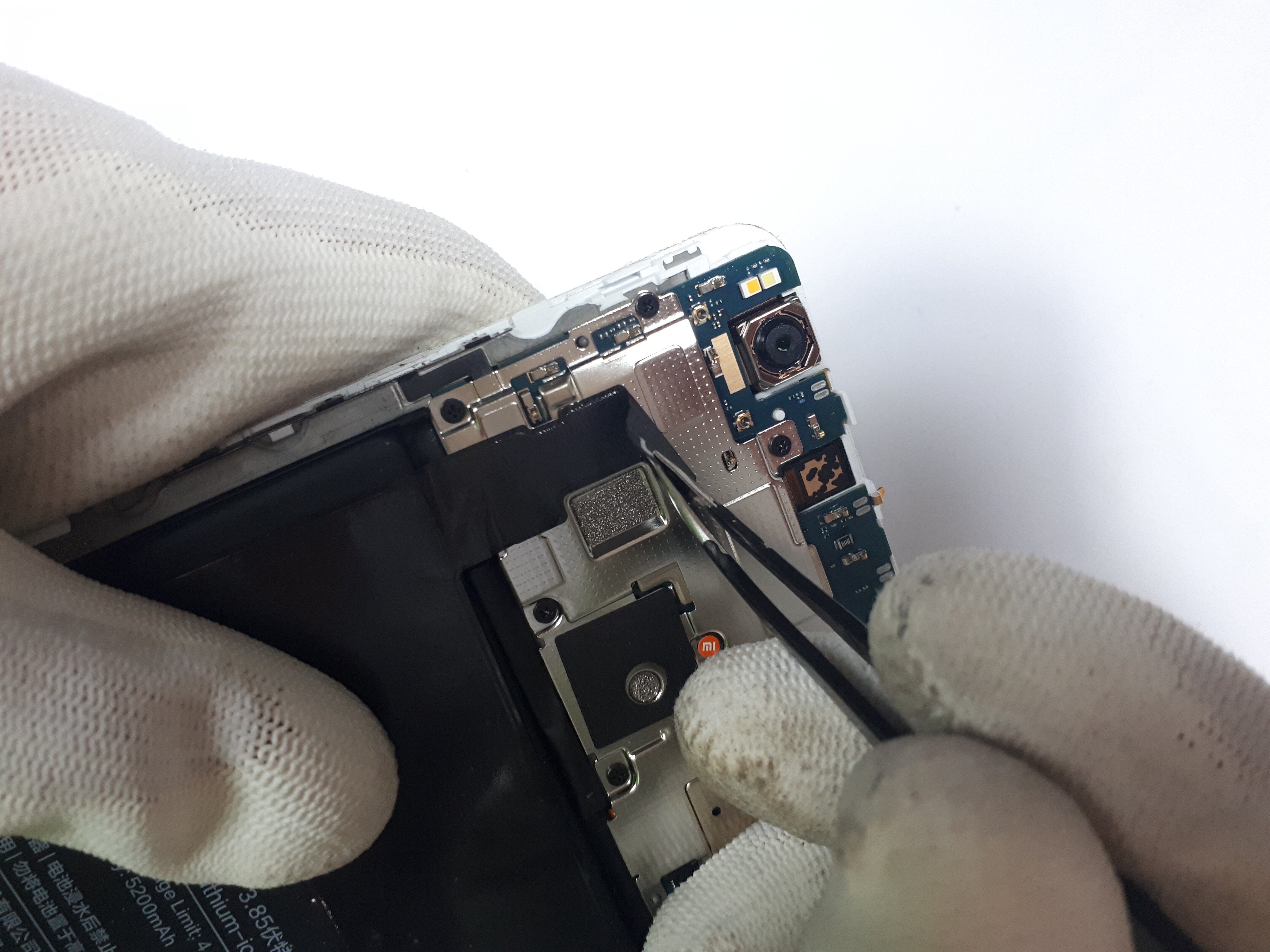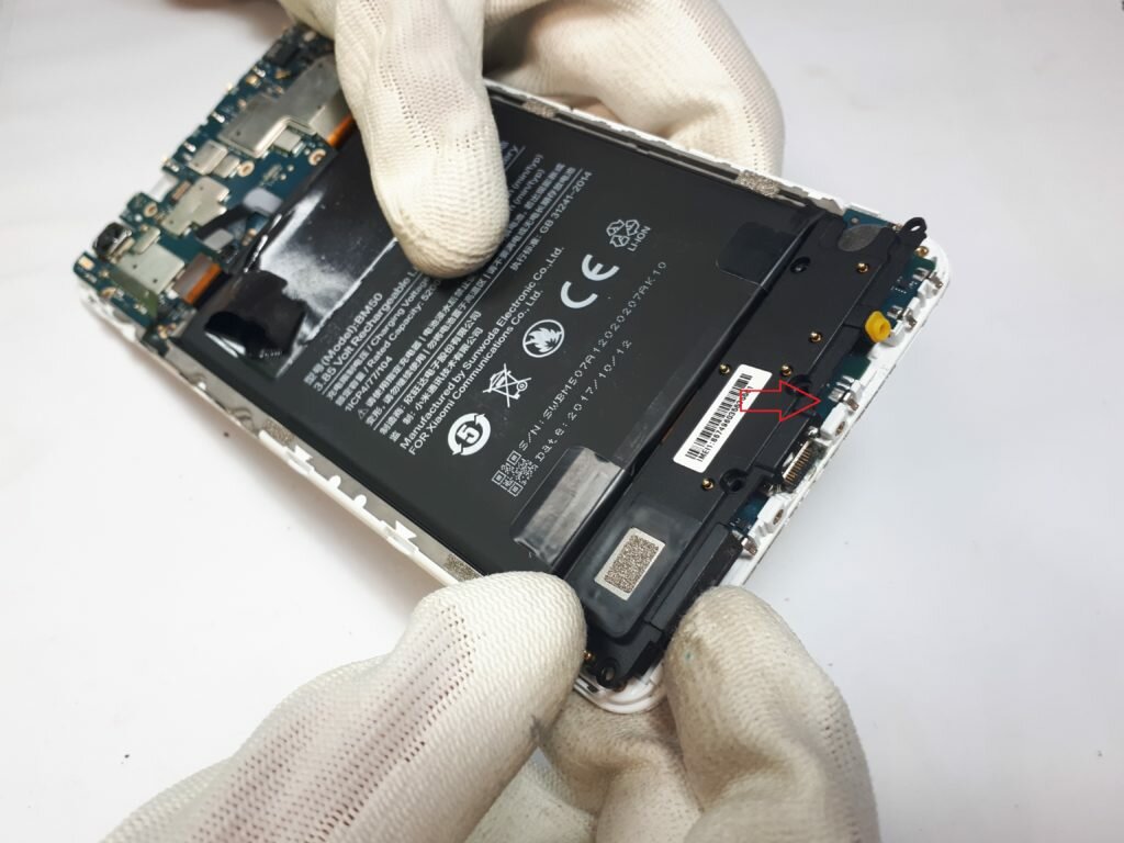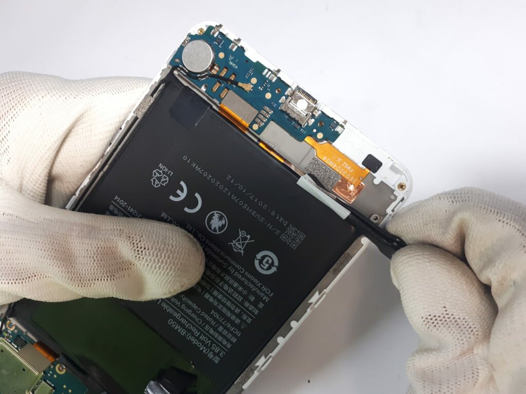 Zdjęcie osłonki wraz z głośnikiem umożliwi nam demontaż baterii, która w przypadku większości modeli Xiaomi wygląda dokładnie tak samo. Pod baterią znajdują się dwustronne samoprzylepne taśmy, które należy wyciągnąć, pozbywając się tym samym kleju trzymającego akumulator.