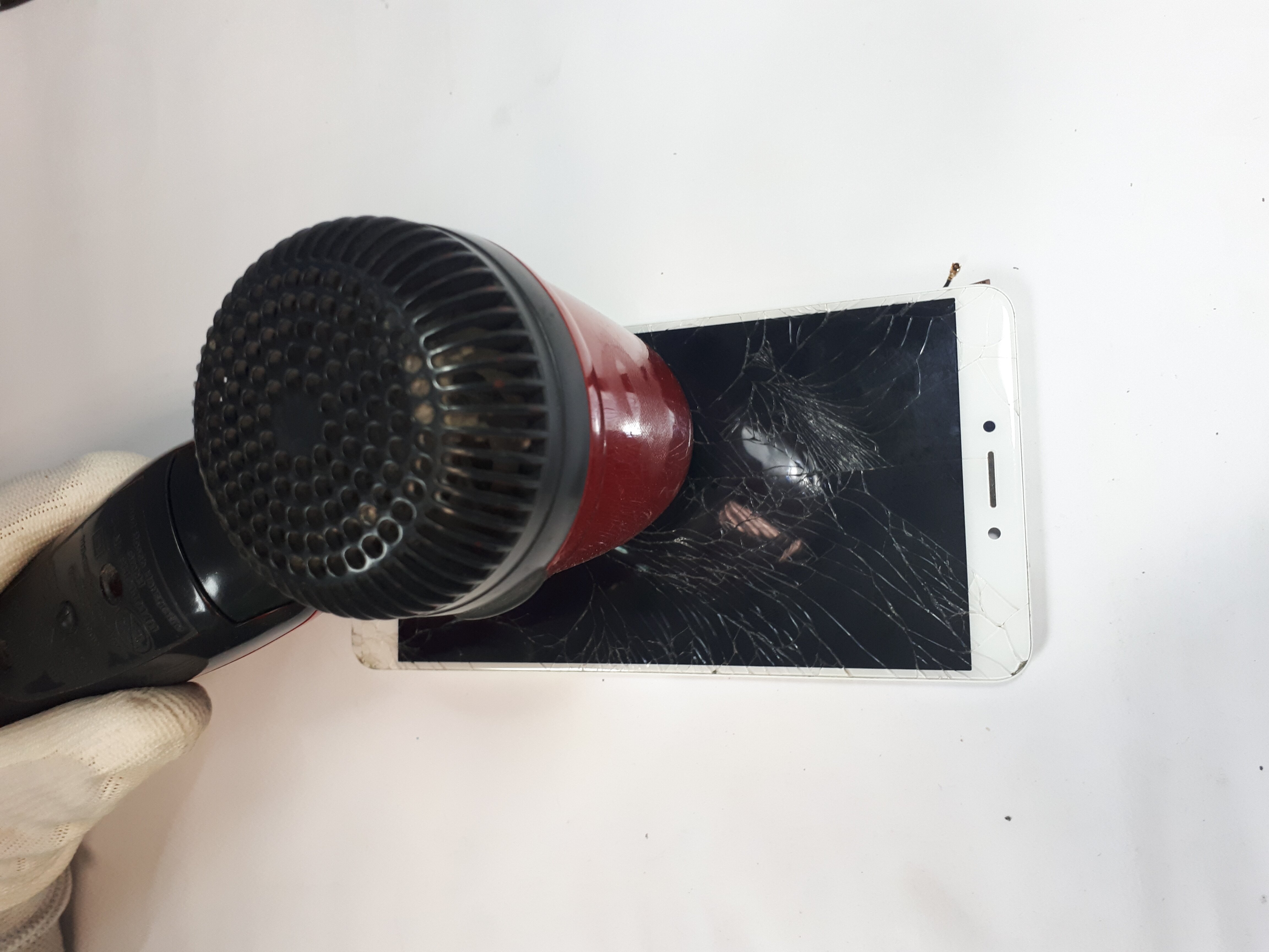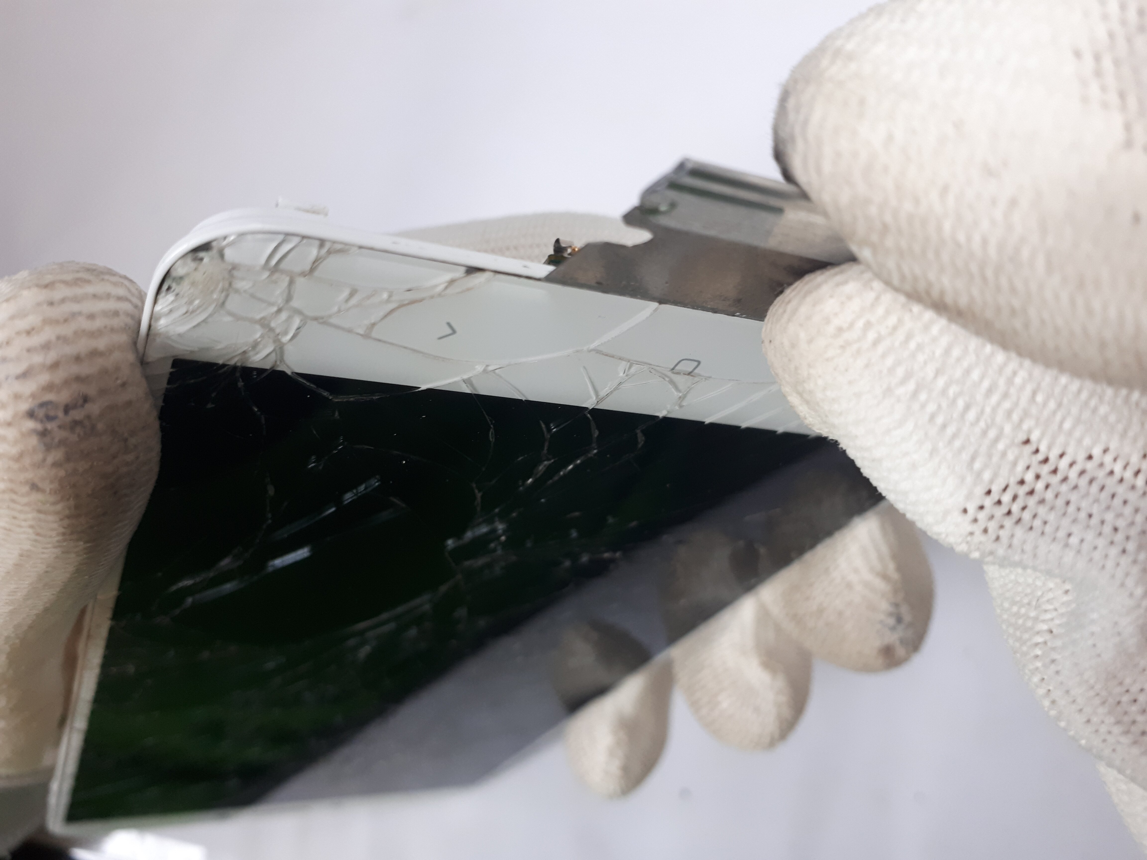 Korzystając z ostrego nożyka lub używanej wcześniej żyletki starajmy się usunąć stary moduł wyświetlacza. W przypadku takiego „dłubania” w szkle możemy spodziewać się, że fragmenty szkła będą się nam sypać na stół. Przy sporych uszkodzeniach ekranu, większe szczelny powinniśmy znaleźć znacznie łatwiej, gdyż struktura całego modułu jest po prostu słabsza. Demontaż wyświetlacza może wymagać od Was ponownego podgrzania ekranu, dlatego miejcie w pogotowiu suszarkę do włosów/opalarkę.