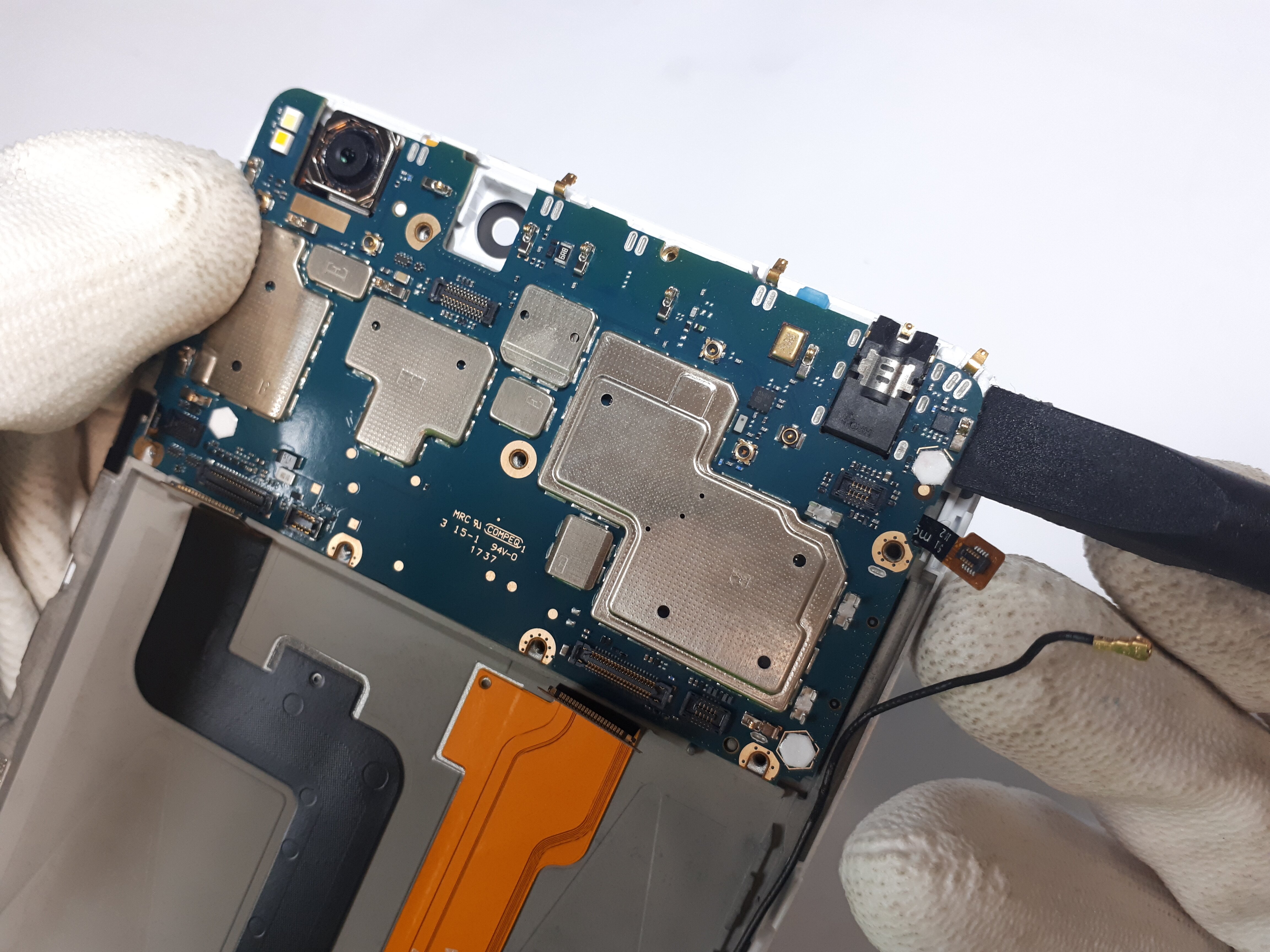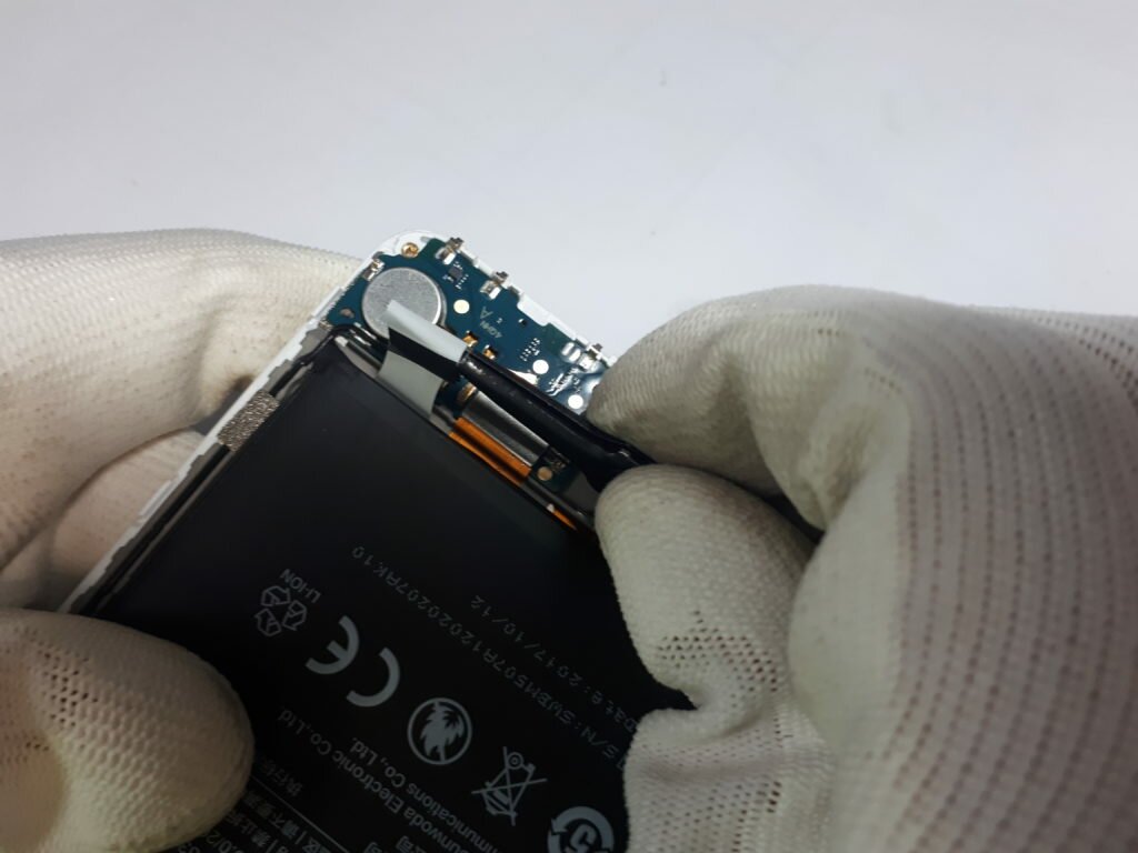 Po zdjęciu blaszki musimy odłączyć wszystkie konektory (w tym kabelek zasięgu), które przypięte są do płyty głównej. Dodatkowo pomiędzy kamerą do selfie oraz gniazdem jack znajduje się dodatkowa czarna śrubka. Aby zdemontować całą płytę musimy ją odkręcić. Do tej czynności wykorzystajmy śrubokręt z grotem krzyżowym, a później otwierak serwisowy spudger.