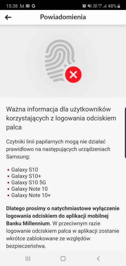 Instytucje bankowe nie czekając na reakcje producenta w sprawie wadliwych czytników (przypomnijmy, że Samsung zapowiedział aktualizacje naprawiającą błędy czytnika) reagują, prosząc swoich klientów o natychmiastowe wyłączenie logowania odciskiem w aplikacjach mobilnych. Jeśli nie dokonamy tych czynności, banki ze względów bezpieczeństwa same zablokują nam możliwość logowania się do aplikacji mobilnych. Nasza redakcja dostała w dniu dzisiejszym taką notatkę od banku Milenium, który bardzo poważnie podszedł do sprawy. W poniższych screenach możemy również wyczytać, że zalecanym działaniem jest usunięcie wszystkich zapisanych dotychczas odcisków palca w celu ponownego zapisania ich dopiero po zdjęciu folii.