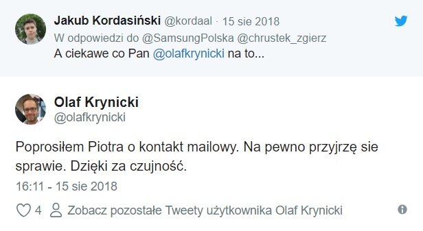 Kończąc, pragniemy zwrócić uwagę na dwie kwestię. Z wypowiedzi Pana Olafa wynika, że zawinił tutaj czynnik ludzki i „nadgorliwość serwisanta”. Nas zastanawia czemu mimo tej nadgorliwości oficjalny profil SamsungGalaxyNote9 nie zastanowił się nad tym co pisze w odpowiedzi do użytkownika na publicznym portalu. Czy to też przykład nadgorliwości Samsunga, a może osoby odpowiadającej? Tak, to tylko nasze spostrzeżenie, które być może nie ma znaczenia w całej tej sprawie. Drugim aspektem, który zastanawia naszą redakcje jest wskazanie przez Pana Olafa, że każdy taki przypadek (nie)rozpatrywany jest indywidualnie. Pozostaje zadać jedno proste pytanie – po co w takim razie zapis w instrukcji mówiący, że „pozostawienie ekranu dotykowego w stanie bezczynności na długi czas może doprowadzić do wystąpienia powidoku (wypalenia ekranu) lub smużenia”.