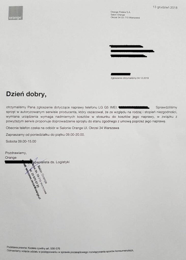 Nasz czytelnik udając się do salonu sieci Orange złożył reklamację zgodnie z przepisami k.c mówiącymi o rękojmi. Po wyjściu z salonu Pan Krzysztof oczekiwał na odpowiedź od swojego sprzedawcy, od którego otrzymał telefon LG G5. Według klienta telefon dość często gubił zasięg GPS, na wyświetlaczu pojawiały się różne smugi oraz poświaty. Usterki mogą wskazywać na ciężkie do zdiagnozowania, ale w końcu tym ma zając się sprzedawca, udzielając tym samym odpowiedzi w ustawowym terminie 14 dni.