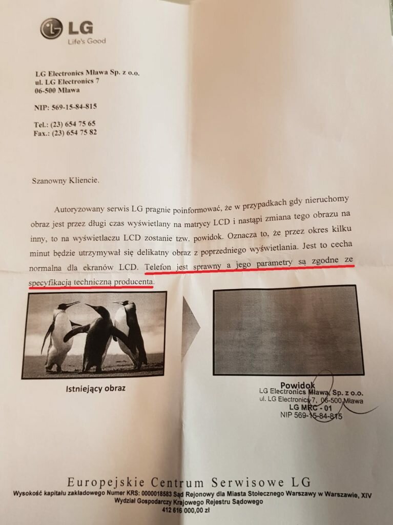 Oprócz tego należy zwrócić uwagę na kwestię powidoku. Z pewnością słyszeliście już o podobnej sprawie w przypadku firmy Samsung, która swoim podejściem do spraw wypalenia ekranu / powidoku wzbudziła wiele kontrowersji oraz oburzenia w reklamacjach różnych klientów. Firma LG podeszła do sprawy inaczej tłumacząc to bardzo technicznie, jednak co z tego? Konsument w chwili zakupu nie otrzymał od sprzedawcy informacji, że w telefonie mogą występować takie powidoki na ekranie. Nie znaleźliśmy również w piśmie producenta LG wskazania, który punkt gwarancji lub instrukcji mógłby się w jakikolwiek sposób odnosić do sprawy. Szybkie podsumowanie jest bardzo proste – Orange deklaruje jakąś „magiczną naprawę wykonaną tylko na piśmie”, a serwis LG wskazuje, że powidoki to nie wada, a cecha. Gdzie w tym wszystkim jest klient, którego nawet nikt nie zapytał, czy jest zadowolony z jakości obsługi tej reklamacji, zarówno po stronie LG, jak i sieci Orange? Miejmy nadzieję, że Pan Krzysztof poradzi sobie ze swoją sprawą i osiągnie cel obiecany przez sprzedawcę.