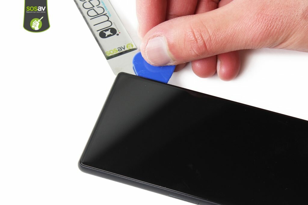 Po kilku minutach spokojnie możemy przystąpić do demontażu wyświetlacza. Do takich działań używamy cieniutkich openerów lub najcieńszego otwieraka. Warto poszukać w naszym asortymencie domowych narzędzi, które mogą nadawać się do takich działań. Podnoszenie wyświetlacza rozpoczynamy od znalezienia wyraźnych szczelin, którymi swobodnie będziemy mogli podważać wyświetlacz w telefonie Sony Xperia 10. Gdy tylko uda się nam wsunąć najcieńszy otwierak, możemy później w szczelinę wsunąć specjalną kostkę serwisową. Jest ona nie tylko wyprofilowana, ale również na środku znajduje się miejsce na palec, abyśmy mogli swobodnie odklejać (podnosić) wyświetlacz.